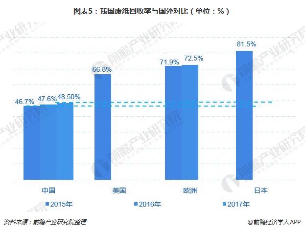 我國的廢紙回收率也從2003年的30.4%提升至了2017年的48.5%,上升了18.1個百分點。雖然我國廢紙回收率不斷提高,但與發(fā)達(dá)國家仍存在較大差距。據(jù)統(tǒng)計,目前發(fā)達(dá)國家的廢紙回收率高達(dá)80%,甚至有些國家可以達(dá)到100%。國內(nèi)廢紙回收率與國外廢紙回收的差距,也正是造成我國廢紙長期依賴進(jìn)口的主要原因之一。