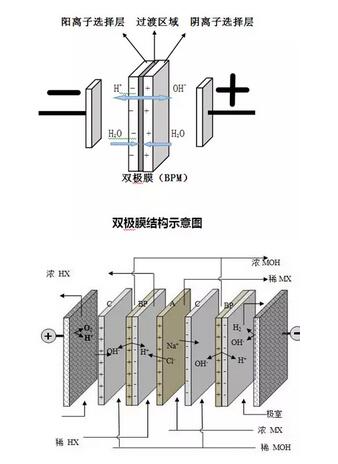 雙極膜亦稱雙極性膜,是特種離子交換膜,它是由一張陽膜和一張陰膜復合制成的陰、陽復合膜。該膜的特點是在直流電場的作用下,陰、陽膜復合層間的H2O解離成H+和OH-并分別通過陰膜和陽膜,作為H+和OH-離子源。在水處理中主要通過離子交換達到凈化水資源的目的。