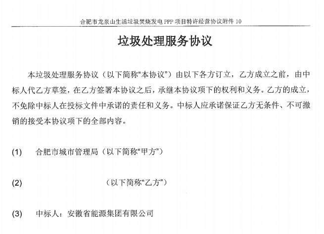 合同名稱:合肥市龍泉山生活垃圾焚燒發(fā)電PPP