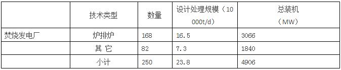 截至2 0 1 6年底,投入運行的生活垃圾焚燒發(fā)電廠有250座,總處理能力為23.8萬噸/日,總裝機約為4906MW。其中采用爐排爐的焚燒發(fā)電廠有168座,合計處理能力達到16.5萬噸/日,裝機達到3040MW;其余主要為采用流化床的焚燒發(fā)電廠,總計有82座,合計處理能力為7.3萬噸/日,裝機達到1840MW(見下表)。
