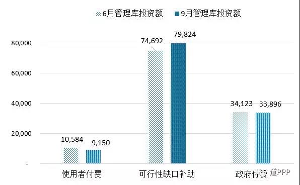 億元,分別占管理庫的43.5%和50.5%。京津冀累計(jì)項(xiàng)目總數(shù)423個(gè)、投資額7,822億元,分別占管理庫的5.1%和6.4%;累計(jì)落地項(xiàng)目總數(shù)216個(gè)、投資額4,763億元,分別占管理庫落地項(xiàng)目的5.3%和7.5%?;貓?bào)機(jī)制方面,三季度使用者付費(fèi)類項(xiàng)目?jī)魷p項(xiàng)目92個(gè)、投資額1,435億元;可行性缺口補(bǔ)助類項(xiàng)目新增項(xiàng)目509個(gè)、投資額5,132億元;政府付費(fèi)類項(xiàng)目新增123個(gè),投資額凈減227億元。管理庫累計(jì)使用者付費(fèi)類項(xiàng)目623個(gè)、投資額9,150億元;累計(jì)可行性缺口補(bǔ)助(即政府市場(chǎng)混合付費(fèi))類項(xiàng)目4,407個(gè)、投資額8.0萬億元;累計(jì)政府付費(fèi)類項(xiàng)目3,259個(gè)、投資額3.4萬億元。