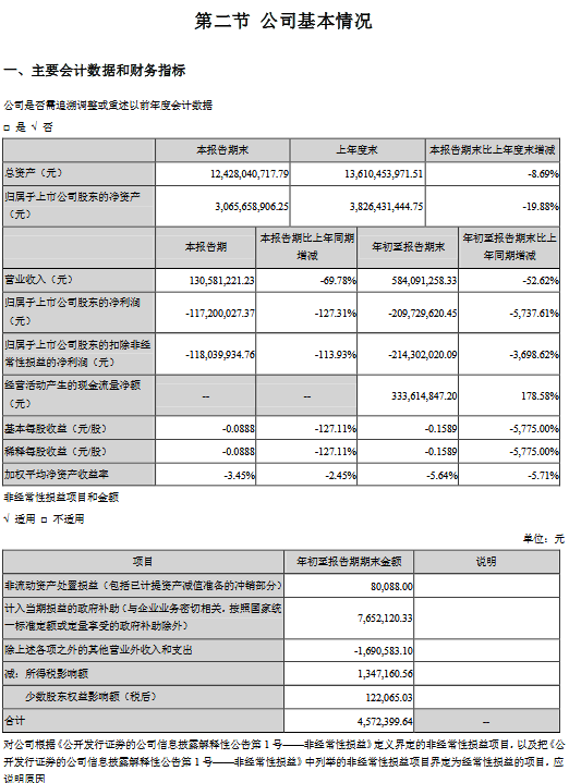 公告顯示,公司前三季度營業(yè)收入584,091,258.33元,同比減少52.62%,歸屬上市公司股東的凈利潤-209,729,620.45元,同比減少5737.61%。