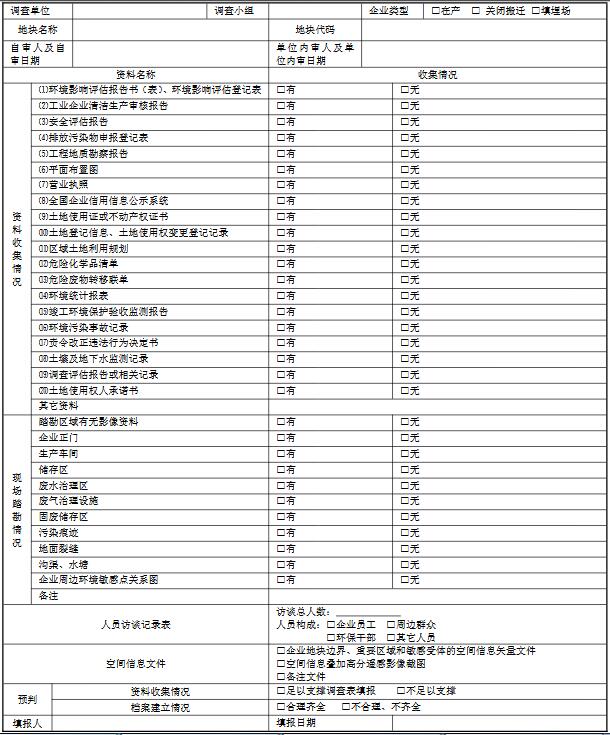 質控人員查看地塊基本資料和輔助資料的收集情況、現(xiàn)場踏勘照片、人員訪談記錄、地塊信息檔案情況和空間信息文件等資料,并填寫地塊調查表填報支撐材料情況(附錄 1),初步評判資料收集