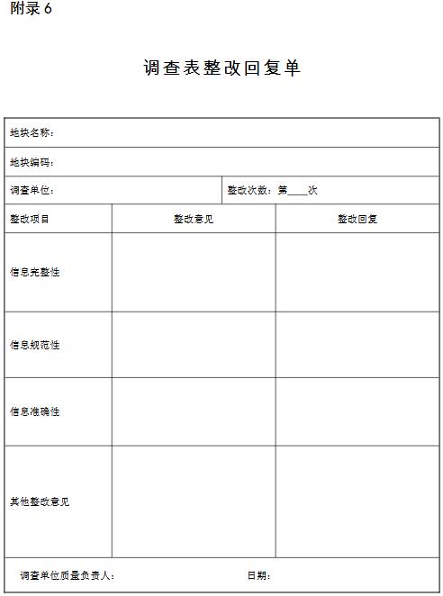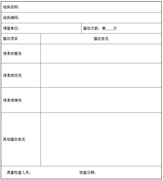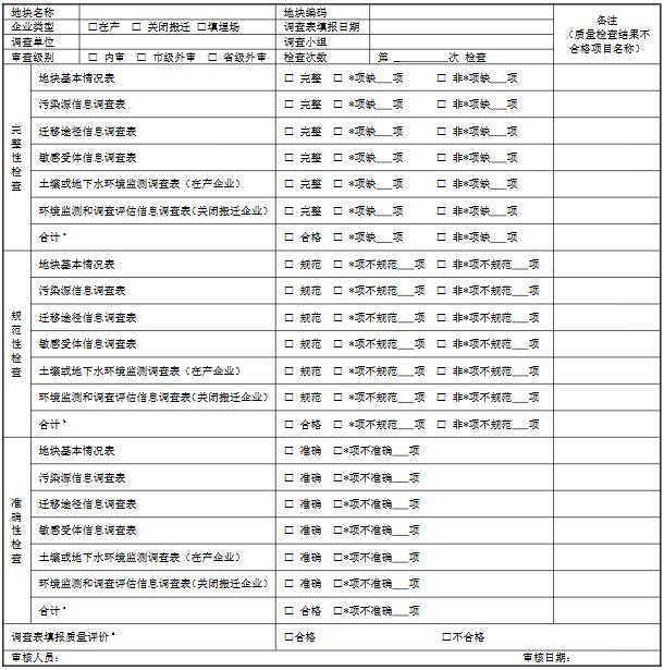 注: a:信息完整性檢查:若帶“*”的未填項數(shù)超過 2 個或不帶“*”的未填項數(shù)超過 5 個,則判定為信息完整性檢查不合格;b:信息規(guī)范性檢查:若帶“*”的不規(guī)范填報項數(shù)超過 2 個或不帶“*”的不規(guī)范填報項數(shù)超過 5 個,則判定為信息規(guī)范性檢查不合格;c:信息準確性檢查:當*項不準確填報項數(shù)超過 2 個,則判定為信息準確性檢查不合格;d:調查表填報質量評價:完整性、規(guī)范性、準確性三者有一項不合格則判定該地塊調查表填報為不合格;若三項均合格,統(tǒng)計調查表中帶“*”的未填信息項、不規(guī)范信息項和不準確信息項總數(shù),超過 5 個則判定為調查表填報質量不合格。對不合格調查表需出具整改意見單。