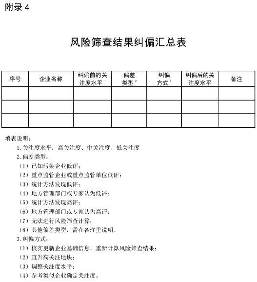 地方環(huán)保部門應組織有關單位按照風險篩查結果糾偏意見,進行問題整改。技術支持單位應填寫風險篩查結果糾偏匯總表(附錄4),并連同專家論證會意見、糾偏專家信息表(附錄 5)、調整后的企業(yè)用地關注度劃分標準(附錄 6)上傳到詳查數(shù)據(jù)庫。風險篩查結果糾偏匯總表及專家論證會意見應加蓋地方環(huán)保部門公章。