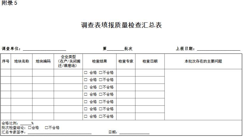 省級和市級質控單位結合本地信息采集工作的組織實施模式,建立信息采集質控工作機制,組建外審質控專家隊伍,制定質控工作計劃;結合信息采集工作進展同步啟動質控工作,分批次對調查單位內審通過后提交的調查表進行檢查,各級質控單位可同步開展外審工作。省級和市級質控單位分別隨機開展外審檢查工作,對每家調查單位已完成調查表的檢查比例不低于 20%,適當加大對在產(chǎn)企業(yè)用地調查表的檢查比例。每個調查表外審完成后填寫調查表填報質量檢查表(附錄 3),對不符合項應進行標注,對檢查不合格的調查表應出具調查表整改意見單(附錄 4)。在一個批次調查表的外審工作完成后,質控單位應填寫調查表填報質量檢查匯總表(附錄 5),出具該批次外審意見。