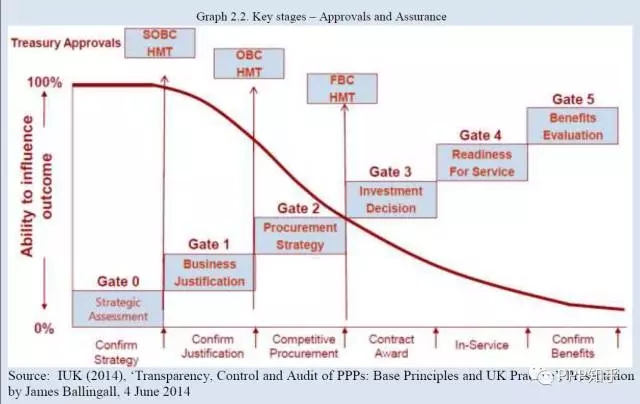 可見,物有所值是PPP項目的核心原則,應(yīng)貫穿在PPP項目實施的全過程動態(tài)管理中,根據(jù)項目關(guān)鍵要素的變化不斷測算、評估和調(diào)整,特別是項目采購和融資交割后,談判簽約的實際情況往往與項目準(zhǔn)備時發(fā)生變化,應(yīng)對基于可研報告和項目實施方案所做的物有所值評估進(jìn)行核算,同時在項目實施期和結(jié)束后的每個重大變化節(jié)點,都應(yīng)開展相應(yīng)的評估工作。英國在PPP項目全過程審查評估中就明確了評估的五個關(guān)鍵關(guān)口(Gate)。