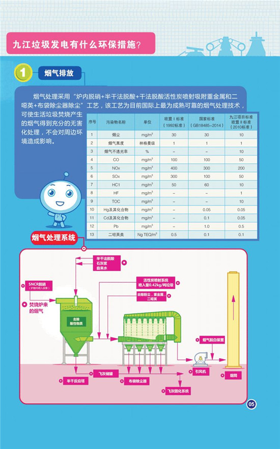 據(jù)介紹,九江垃圾焚燒發(fā)電項目煙氣凈化工藝采用“SNCR脫硝+半干法脫酸+干法脫酸+活性炭吸附+布袋除塵+煙氣再循環(huán)”的組合工藝技術(shù),達到并優(yōu)于歐盟2010標(biāo)準(zhǔn)。滲濾液和其他廢水處理達標(biāo)后全部廠內(nèi)回用。年供綠色電能3億度,節(jié)約標(biāo)準(zhǔn)煤12萬噸/年,二氧化碳減排2.5萬噸/年,COD減排1.5萬噸/年。