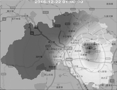 2016年12月22日,北京市發(fā)生重污染天氣過程。昌平區(qū)環(huán)保部門正是通過以上的熱力圖判斷本時(shí)間點(diǎn)昌平區(qū)西部地區(qū)的空氣質(zhì)量較好,重污染重點(diǎn)區(qū)域集中在崔村鎮(zhèn),并以此為中心向四周擴(kuò)散。