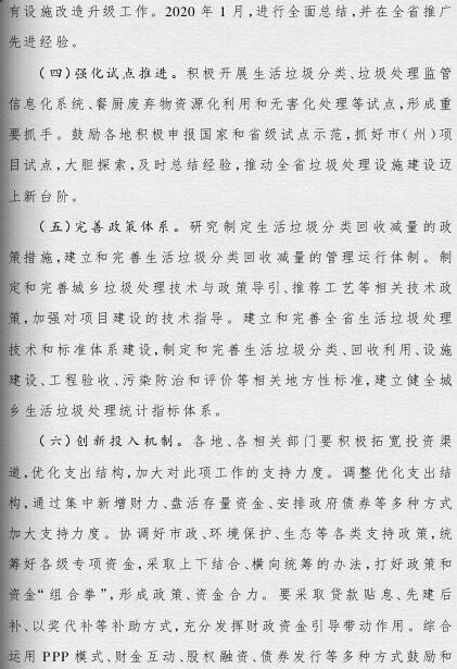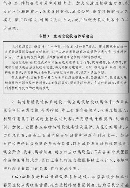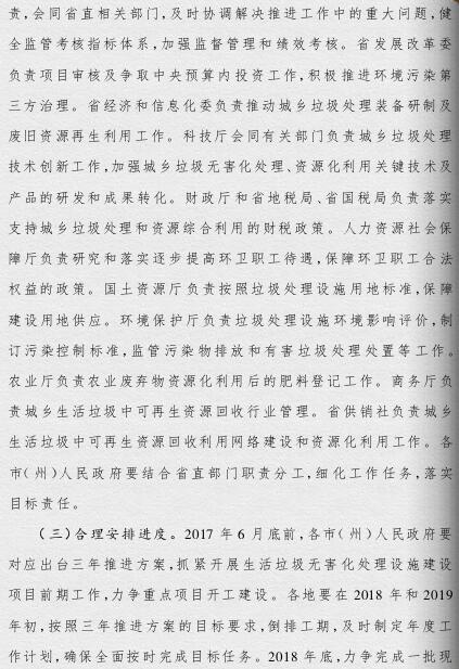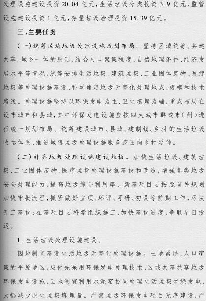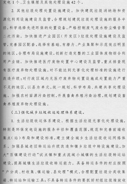 《方案》提出,要根據(jù)人口聚集程度、自然地理?xiàng)l件、經(jīng)濟(jì)發(fā)展水平等情況統(tǒng)籌規(guī)劃布局垃圾處理設(shè)施建設(shè);要補(bǔ)齊垃圾處理設(shè)施建設(shè)短板,到2019年底,新建生活垃圾無(wú)害化處理設(shè)施76座,完成無(wú)害化處理設(shè)施改擴(kuò)建43個(gè)和存量垃圾治理項(xiàng)目62個(gè)。