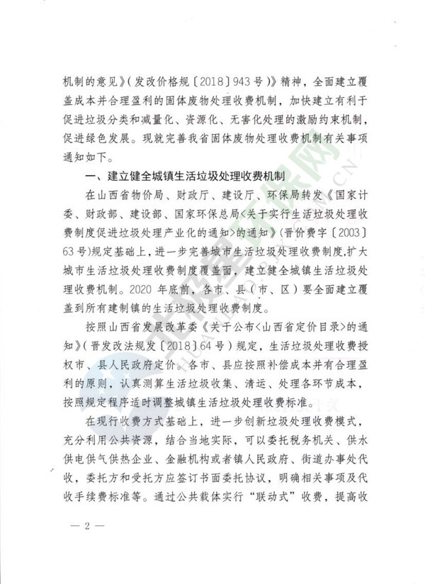 山西省發(fā)改委等五部門聯(lián)合下發(fā)《關(guān)于完善固體廢物處理收費機制的通知》(全文)