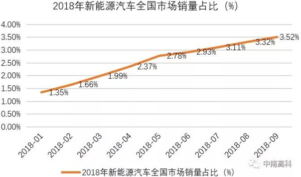 2018年1~9月(10月統(tǒng)計(jì)數(shù)據(jù)還未出),全國(guó)汽車(chē)?yán)塾?jì)銷(xiāo)量2049.06萬(wàn)輛,累計(jì)同比增長(zhǎng)1.49%;新能源汽車(chē)?yán)塾?jì)銷(xiāo)量72.1萬(wàn)輛,同比增長(zhǎng)81.1%。今年以來(lái),全國(guó)汽車(chē)銷(xiāo)量同比增速除了1月份為11.59%,其余月份增速均在10%以下,且大部分月份同比增速低于5%;而新能源汽車(chē)月累計(jì)同比增速均在100%上下,遠(yuǎn)高于全國(guó)汽車(chē)?yán)塾?jì)同比增速,新能源汽車(chē)在全國(guó)市場(chǎng)的占比由年初的1.35%上升至9月份的3.52%,在市場(chǎng)的占比正在快速上升。新能源汽車(chē)越來(lái)越成為決定未來(lái)國(guó)內(nèi)整車(chē)生產(chǎn)企業(yè)競(jìng)爭(zhēng)優(yōu)勢(shì)的關(guān)鍵著力點(diǎn),也正在面臨越來(lái)越多的新參與者加入。