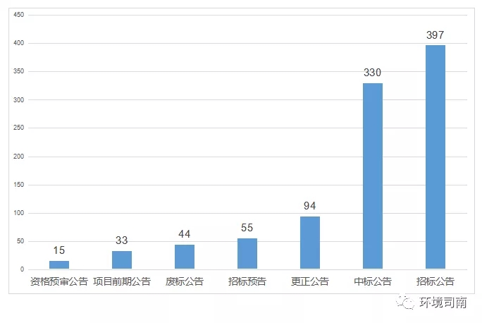 11月上旬(11月1日-10日)全國各地共發(fā)布環(huán)衛(wèi)運(yùn)營類項(xiàng)目公開招標(biāo)采購信息968個,其中:項(xiàng)目前期公告33個,招標(biāo)預(yù)告55個,招標(biāo)公告397個,資格預(yù)審公告15個,更正公告94個,中標(biāo)公告330個,廢標(biāo)及流標(biāo)公告44個。