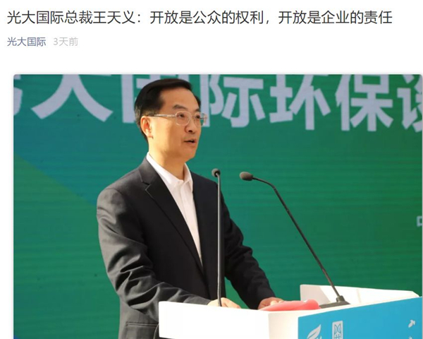 企業(yè)是污染治理的責(zé)任主體,達(dá)標(biāo)排放,既是法律的基本要求,也是企業(yè)履行環(huán)境責(zé)任不可逾越的底線。向公眾開(kāi)放環(huán)保設(shè)施,讓污染治理設(shè)施在群眾監(jiān)督之下運(yùn)行,將有助于企業(yè)進(jìn)一步增強(qiáng)內(nèi)在治污動(dòng)力,不斷提升環(huán)境管理水平。開(kāi)放是企業(yè)自律與他律的良性互動(dòng)。今天,光大國(guó)際正式宣布以「一個(gè)企業(yè)整體」的名義,率先向社會(huì)開(kāi)放公司旗下垃圾發(fā)電、污水處理、危廢處置、生物質(zhì)發(fā)電等業(yè)務(wù)領(lǐng)域77個(gè)環(huán)保設(shè)施,自愿主動(dòng)接受公眾和社會(huì)監(jiān)督。