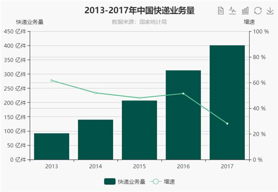 網(wǎng)購(gòu)的發(fā)達(dá)促進(jìn)了快遞市場(chǎng)的發(fā)展。據(jù)國(guó)家郵政局統(tǒng)計(jì),2013-2017年中國(guó)快遞業(yè)務(wù)量正在以驚人的速度上升。91.9億到400億,短短五年間這個(gè)數(shù)字竟然翻了四點(diǎn)三倍。