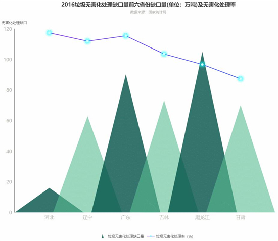 從下圖我們還可以得知,盡管我國(guó)的垃圾無(wú)害化處理率相當(dāng)高,基本在70%以上,但由于垃圾清運(yùn)量龐大,垃圾缺口量依舊龐大(缺口量為垃圾清運(yùn)量減去垃圾無(wú)害化處理量)。其中黑龍江缺口量達(dá)105萬(wàn)噸,廣東缺口量達(dá)90.3萬(wàn)噸。這些未經(jīng)無(wú)害化處理的垃圾是環(huán)境污染的重要源頭。