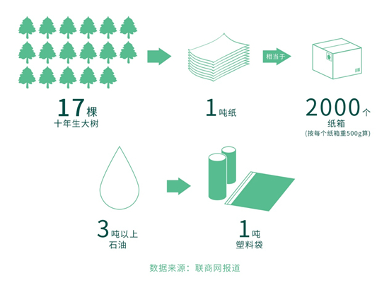快遞包裝以紙張、塑料等形式為主,其原材料大多源于木材、石油等。根據(jù)相關(guān)專家測(cè)算,生產(chǎn)1噸紙需砍伐17棵十年生大樹(shù),生產(chǎn)1噸塑料袋需消耗3噸以上石油。回收率低也就意味著浪費(fèi)生產(chǎn)資源。中國(guó)快遞協(xié)會(huì)副秘書長(zhǎng)楊駿說(shuō),每年由快遞包裹帶來(lái)的包裝廢棄物達(dá)到百萬(wàn)噸。