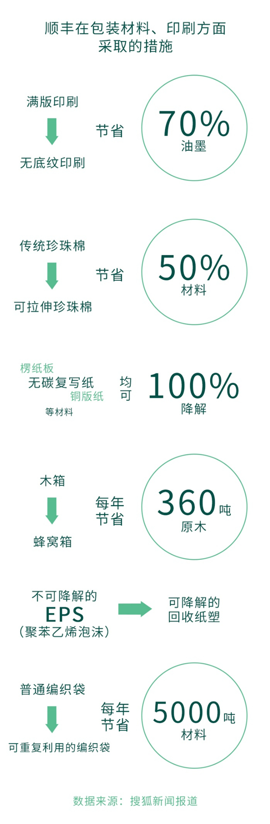 例如順豐在包裝材料、印刷方面,將滿版印刷改為無(wú)底紋印刷,可以節(jié)省油墨用量70%;利用可拉伸珍珠棉代替?zhèn)鹘y(tǒng)珍珠棉,節(jié)省材料50%;在環(huán)保材料方面,使用的楞紙板、無(wú)碳復(fù)寫紙、銅版紙等材料均可100%降解,還使用蜂窩箱代替木箱包裝,每年可節(jié)約原木360噸;利用可降解的回收紙塑代替不可降解的EPS(聚苯乙烯泡沫)材料;除此之外,使用可重復(fù)利用的編織袋代替普通編織袋,每年可節(jié)省材料5000多噸。