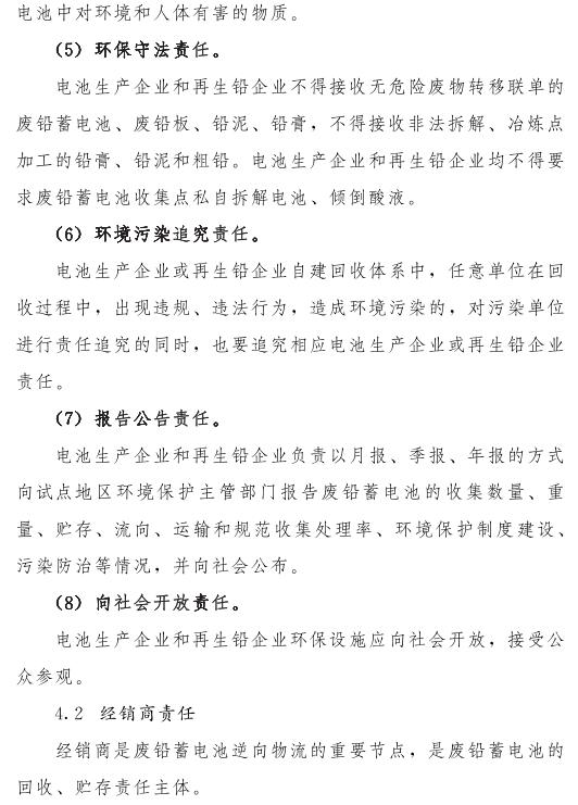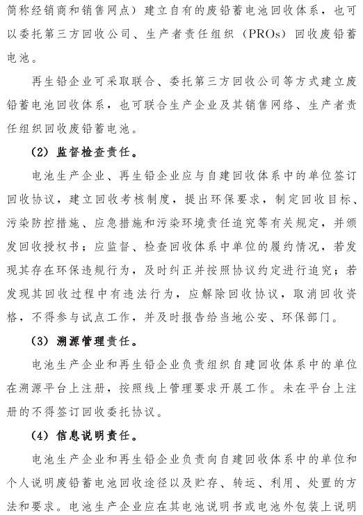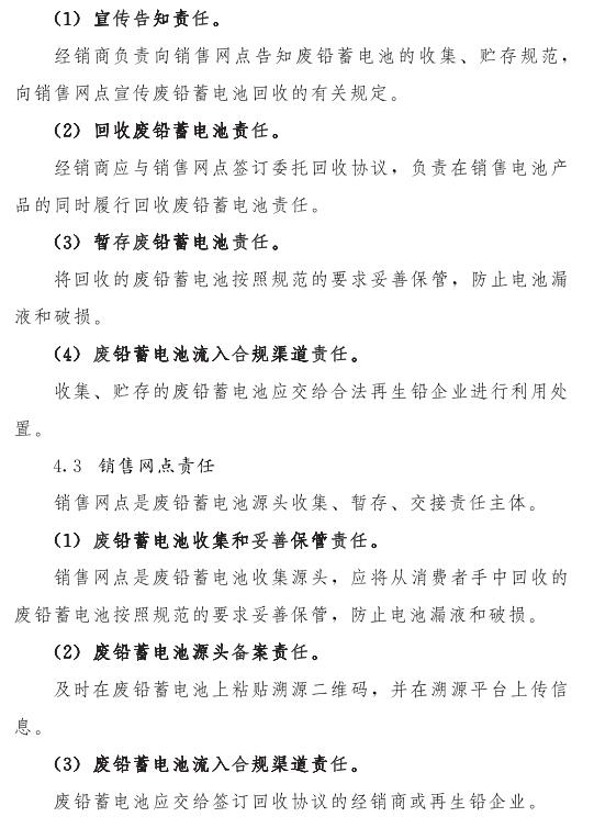 推動(dòng)落實(shí)生產(chǎn)者責(zé)任延伸制度,由鉛蓄電池生產(chǎn)企業(yè)依托自有銷售渠道建立廢鉛蓄電池逆向物流回收體系,持危險(xiǎn)廢物經(jīng)營(yíng)許可證的再生鉛企業(yè)可通過自主回收、聯(lián)合回收或委托回收等方式建立回收體系。鼓勵(lì)生產(chǎn)企業(yè)和持證企業(yè)進(jìn)行信息溝通和密切合作,以市場(chǎng)為導(dǎo)向,建立穩(wěn)定的商業(yè)交易模式,并采取以舊換新等措施,不斷提高收集處理率。各回收體系收集的廢鉛蓄電池最終須交由具有危險(xiǎn)廢物經(jīng)營(yíng)許可證的再生鉛企業(yè)利用處置。制定 《廢鉛蓄電池規(guī)范化管理指南》,明確回收體系中各環(huán)節(jié)、各責(zé)任主體責(zé)任及廢鉛蓄電池管理規(guī)范。參與廢鉛蓄電池回收的各責(zé)任主體須嚴(yán)格遵守 《廢鉛蓄電池規(guī)范化管理指南》的各項(xiàng)規(guī)定。