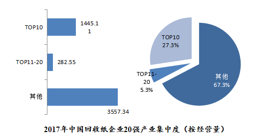 從回收紙行業(yè)二十強集中度看,2017年中國回收紙回收總量為5460萬噸,二十強企業(yè)經營總量為1727.66萬噸,占全國總量31.6%;前10強企業(yè)經營總量為1445.11萬噸,占前二十強總量的83.6%,占全國總量的26.5%,產業(yè)集中度較高;且有7家企業(yè)連續(xù)兩年進入前10強,帶領行業(yè)發(fā)展的影響力不斷增強。近年受到國家環(huán)保監(jiān)督和進口管控等因素影響,2016年二十強上榜的3家企業(yè)在回收、生產、銷售等方面受影響較大,未能在2017年保持穩(wěn)定發(fā)展,進入前二十強排名,導致2017年的產業(yè)集中度相較于2016年有所下降。