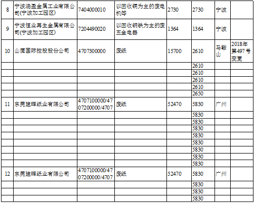 日前中國固廢化學(xué)品管理網(wǎng)發(fā)布了《建議批準(zhǔn)的限制進(jìn)口類申請明細(xì)表(2018年第24批)》,其中涉及30家企業(yè)具體內(nèi)容如下: