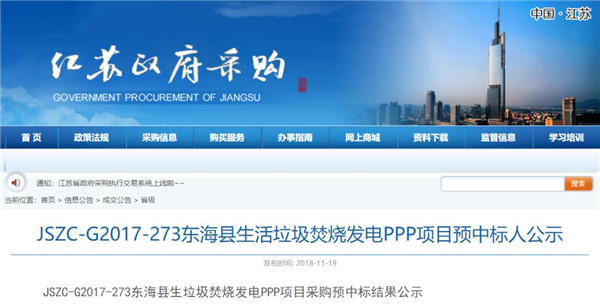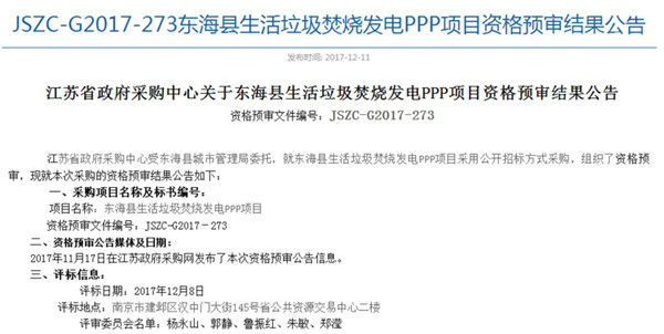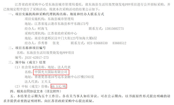 19日江蘇政府采購網(wǎng)發(fā)布了《JSZC-G2017-273東海縣生活垃圾焚燒發(fā)電PPP項目預(yù)中標人公示》,公示顯示,光大國際以49.5元/噸的價格成為預(yù)中標人,相關(guān)的信息如下: