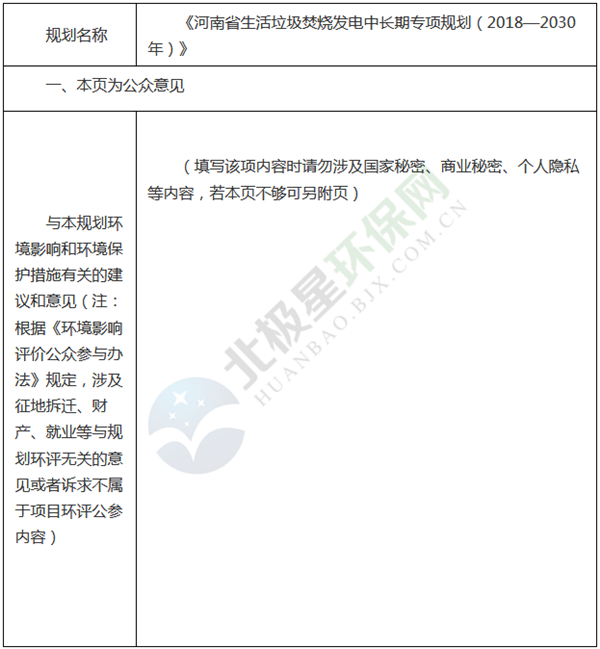 河南省生活垃圾焚燒發(fā)電中長期專項(xiàng)規(guī)劃(2018-2030年)環(huán)境影響評價公眾意見表