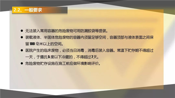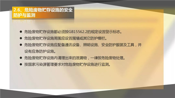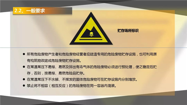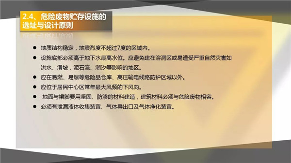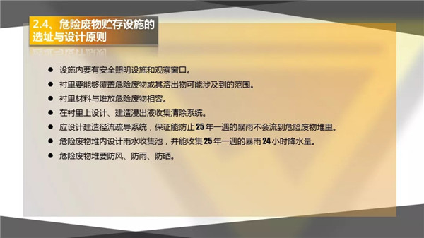 3)危險(xiǎn)廢物暫存場所選址要合理,并且需有防腐、防滲、防漏措施,及廢氣、廢水收集設(shè)施;