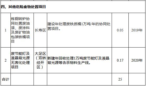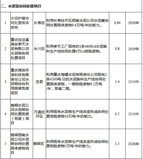 重慶市危險廢物集中處置設(shè)施建設(shè)布局規(guī)劃項目一覽表(2018-2022年)