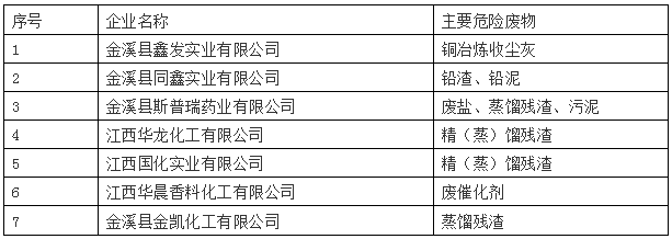 金溪縣產(chǎn)生危險(xiǎn)廢物的相關(guān)企業(yè): 為進(jìn)一步規(guī)范危險(xiǎn)廢物管理,建立危險(xiǎn)廢物產(chǎn)生單位信息,根據(jù)各涉危險(xiǎn)廢物企業(yè)增加以及生產(chǎn)經(jīng)營(yíng)變化等情況,我局對(duì)全縣產(chǎn)生危險(xiǎn)廢物監(jiān)管企業(yè)名單進(jìn)行了更新,現(xiàn)予以公布。