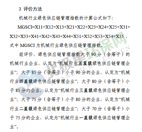 11月23日《機械行業(yè)綠色供應(yīng)鏈管理企業(yè)評價指標體系》、《汽車行業(yè)綠色供應(yīng)鏈管理企業(yè)評價指標體系》及《電器電子行業(yè)綠色供應(yīng)鏈管理企業(yè)評價指標體系》公示征求意見,具體內(nèi)容如下: