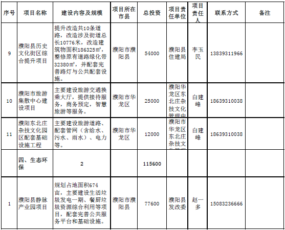 生態(tài)環(huán)保領(lǐng)域項(xiàng)目2個,總投資115600萬元,主要包括濮陽縣靜脈產(chǎn)業(yè)園項(xiàng)目、臺前縣靜脈產(chǎn)業(yè)園生活垃圾焚燒發(fā)電廠及污泥處置建設(shè)項(xiàng)目。