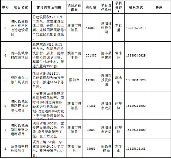 城市建設(shè)領(lǐng)域項(xiàng)目11個,總投資2564340萬元,主要包括濮陽市公共停車場項(xiàng)目、濮陽市旅游集散中心建設(shè)項(xiàng)目、濮陽縣城投公司棚戶區(qū)改造建設(shè)項(xiàng)目、清豐縣城中村改造項(xiàng)目等。