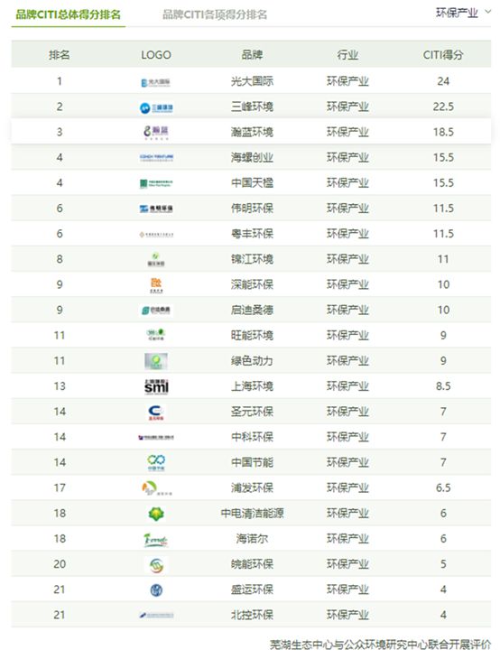 在本期CITI指數(shù)排行榜中,環(huán)保產(chǎn)業(yè)品牌占22個(gè),榮登環(huán)保產(chǎn)業(yè)CITI指數(shù)排名前三甲的是光大國(guó)際、三峰環(huán)境和瀚藍(lán)環(huán)境。