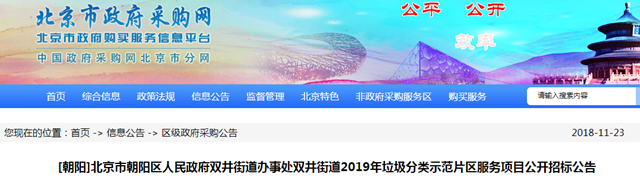 2018年11月23日,北京市朝陽(yáng)區(qū)雙井街道2019年垃圾分類示范片區(qū)服務(wù)項(xiàng)目發(fā)布公開(kāi)招標(biāo)公告。