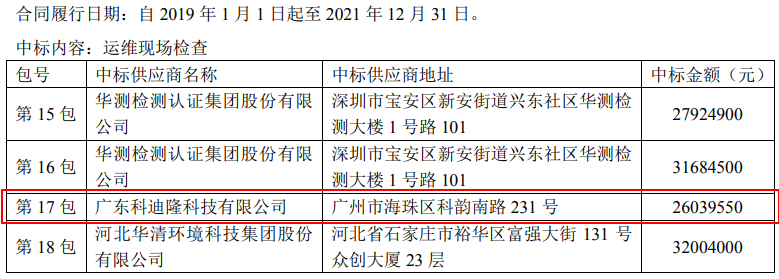 11月15日,中國(guó)環(huán)境監(jiān)測(cè)總站“國(guó)家環(huán)境空氣監(jiān)測(cè)網(wǎng)城市環(huán)境空氣自動(dòng)監(jiān)測(cè)站運(yùn)行維護(hù)項(xiàng)目”對(duì)外公布中標(biāo)結(jié)果。前19包招標(biāo)成功,總金額為8.39億元。其中,廣東科迪隆科技有限公司(簡(jiǎn)稱“科迪隆”)中標(biāo)運(yùn)維現(xiàn)場(chǎng)檢查第17包,中標(biāo)金額為26,039,550元。