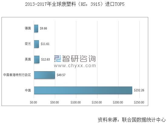 2017年我國(guó)再生塑料產(chǎn)量為1693萬(wàn)噸,同步下降9.85%。從原材料市場(chǎng)供給來(lái)看,2013-2017年間,中國(guó)是全球最大的廢塑料(HS:3915)進(jìn)口國(guó),進(jìn)口總額達(dá)232.26億美元,排在第二位的是中國(guó)香港特別行政區(qū),進(jìn)口總額為49.57億美元,美國(guó)、荷蘭、德國(guó)進(jìn)口總額依次為12.63億美元、11.61億美元、9.66億美元。