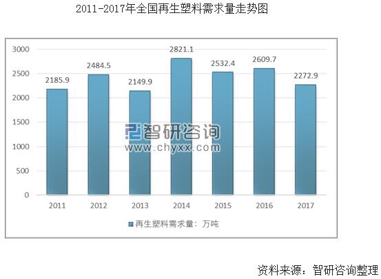 由于產(chǎn)量產(chǎn)能供給減少,我國(guó)再生塑料需求量從2014年的2821.1萬(wàn)噸下降至2017年的2272.9萬(wàn)噸。