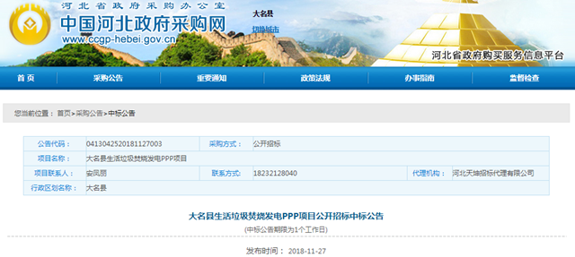 2018年11月27日,河北省大名縣生活垃圾焚燒發(fā)電PPP項目發(fā)布中標公告,上??岛悱h(huán)境股份有限公司成為中標的社會資本方,垃圾處理服務(wù)費單價為57元/噸。