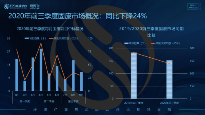 市場走勢:固廢市場項目建設(shè)投資總額較2019年同期下降24% 據(jù)E標(biāo)通獲悉,2020年前三季度共計釋放固廢項目150余個,建設(shè)投資總額約420億元。左圖為2020年前三季度每月固廢項目中標(biāo)情況,4月固廢項目的釋放量最多,建設(shè)投資總額最大(91.4億元)。與2019年同期相比(右圖),2020年前三季...