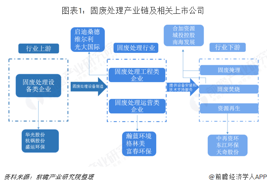 我國固廢處理行業(yè)已經(jīng)形成了較為成熟的產(chǎn)業(yè)鏈,其中上游行業(yè)為固廢處理裝備制造;中游行業(yè)按照公司主營業(yè)務(wù)類別不同可以分為固廢處理工程類企業(yè)和固廢處理運(yùn)營類企業(yè);下游行業(yè)為固廢處置衍生行業(yè),主要分為固廢掩埋、固廢焚燒和資源再生。上游行業(yè)較為成熟,為固廢處理行業(yè)打下良好的基礎(chǔ);中游行業(yè)參與者多為上市公司,行...