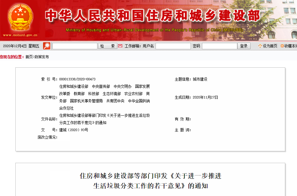文章導(dǎo)讀12月4日,住建部、中共中央委員會(huì)宣傳部等12部門(mén)印發(fā)《關(guān)于進(jìn)一步推進(jìn)生活垃圾分類工作的若干意見(jiàn)》的通知(以下簡(jiǎn)稱《通知》)。《通知》全文如下:住房和城鄉(xiāng)建設(shè)部等部門(mén)印發(fā)《關(guān)于進(jìn)一步推進(jìn)生活垃圾分類工作的若干意見(jiàn)》的通知各省、自治區(qū)、直轄市人民政府,中央和國(guó)家機(jī)關(guān)有關(guān)部門(mén)、單位:《關(guān)于進(jìn)一步...