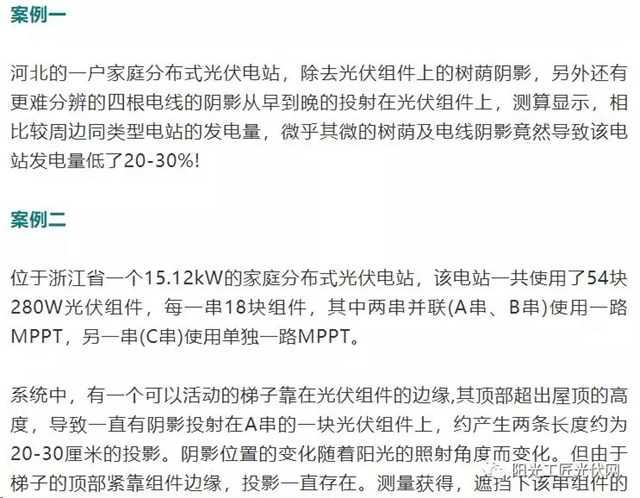 眾所周知,光伏電站中的陰影遮擋,其中包括電線桿、植物、鳥(niǎo)糞、灰塵以及組件的前后排遮擋等,那么光伏系統(tǒng)的發(fā)電量究竟會(huì)有多少變化,對(duì)于投資收益的影響又有多少呢? 在家庭戶用電站中,很多的業(yè)主為了安裝時(shí)的一次性到位,往往不能完全避開(kāi)陰影,因?yàn)闃I(yè)主們覺(jué)得反正陰影遮擋的區(qū)域并不大,不會(huì)嚴(yán)重影響發(fā)電量。但實(shí)際上...