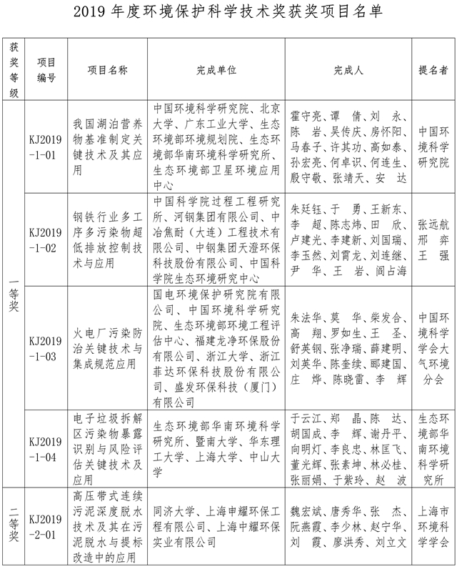 根據(jù)《環(huán)境保護(hù)科學(xué)技術(shù)獎(jiǎng)勵(lì)辦法》的規(guī)定,經(jīng)有關(guān)專家、單位提名和專家評(píng)審,并通過(guò)廣泛公示,環(huán)境保護(hù)科學(xué)技術(shù)獎(jiǎng)勵(lì)委員會(huì)批準(zhǔn)39個(gè)項(xiàng)目獲2019年度環(huán)境保護(hù)科學(xué)技術(shù)獎(jiǎng),其中:一等獎(jiǎng)4項(xiàng),二等獎(jiǎng)33項(xiàng),科普類獎(jiǎng)2項(xiàng)。 附:2019年度環(huán)境保護(hù)科學(xué)技術(shù)獎(jiǎng)獲獎(jiǎng)項(xiàng)目名單 環(huán)境保護(hù)科學(xué)技術(shù)獎(jiǎng)勵(lì)辦公室 2019年12...