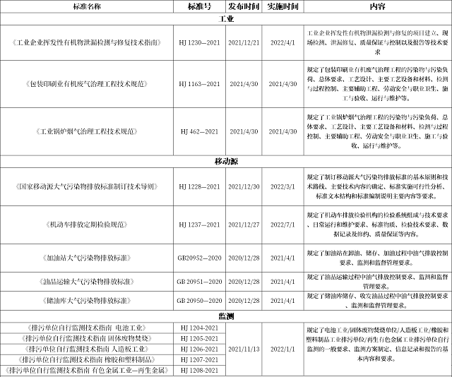 2022年4月1日,國家生態(tài)環(huán)境標(biāo)準(zhǔn)《工業(yè)企業(yè)揮發(fā)性有機(jī)物泄漏檢測(cè)與修復(fù)技術(shù)指南》將正式施行。 其實(shí),自生態(tài)環(huán)境保護(hù)工作步入第十四個(gè)五年規(guī)劃以來,作為深入打好污染防治攻堅(jiān)戰(zhàn)的重要環(huán)節(jié),大氣污染防治相關(guān)標(biāo)準(zhǔn)就一直在陸續(xù)更新中,涉及工業(yè)、移動(dòng)源、監(jiān)測(cè)等多個(gè)領(lǐng)域,粗略整理如下: 《工業(yè)企業(yè)揮發(fā)性有機(jī)物泄漏...