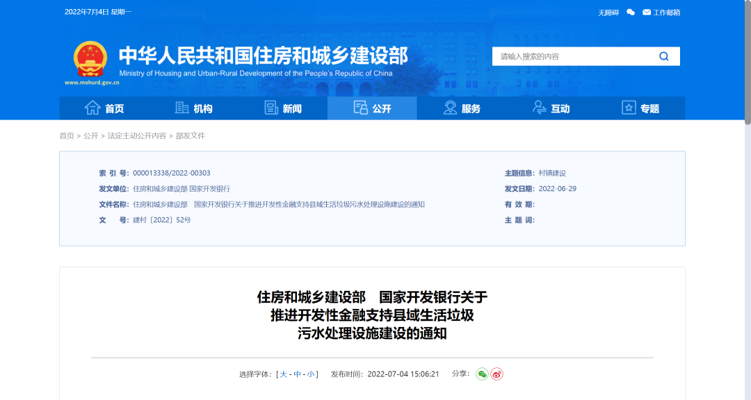 縣域生活垃圾污水處理設(shè)施建設(shè)“錢”的問題,終于有了解決方案。 7月4日,住房和城鄉(xiāng)建設(shè)部、國家開發(fā)銀行聯(lián)合發(fā)布《關(guān)于推進(jìn)開發(fā)性金融支持縣域生活垃圾污水處理設(shè)施建設(shè)的通知》(下稱《通知》),對縣域生活垃圾污水處理設(shè)施建設(shè)給出金融支持。 具體來講,未來如果是納入項(xiàng)目儲備庫的項(xiàng)目,...