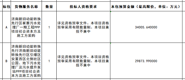 近日,中國政府采購網(wǎng)發(fā)布山東省濟南市先行區(qū)污水處理廠PPP項目社會資本方及施工方采購資格預審公告,采購項目共2個,A標包為濟南新舊動能轉(zhuǎn)換先行區(qū)崔寨污水處理廠一期工程PPP項目社會資本方及施工方采購,預算金額34005.64萬元,B標包為濟南新舊動能轉(zhuǎn)換先行濟南新舊動能轉(zhuǎn)換先行區(qū)引爆區(qū)安置西區(qū)北側(cè)社...