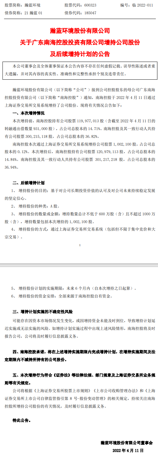 2022年4月11日,瀚藍環(huán)境股份有限公司(下稱“瀚藍環(huán)境”)發(fā)布公告稱,廣東南??毓赏顿Y有限公司(下稱“南海控股”)已成功通過上海證券交易所交易系統(tǒng)增持了股份。 據(jù)了解,本次增持前,南海控股持有瀚藍環(huán)境14.71%的股份,及其一致行動人共持有瀚藍環(huán)境...