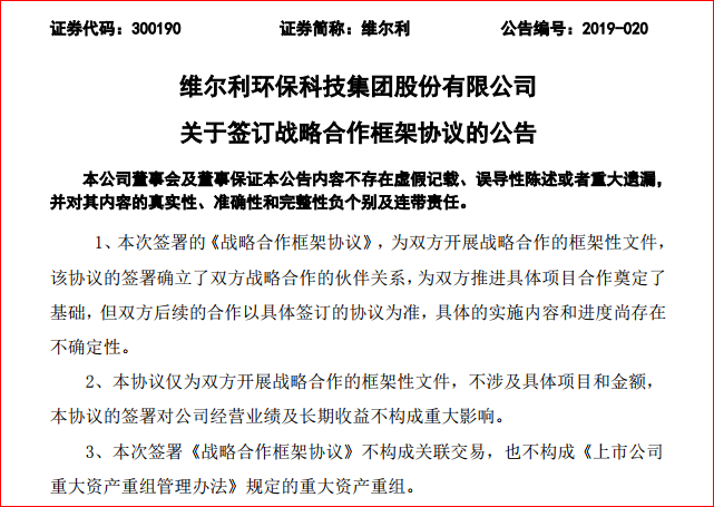 2019年3月18日,維爾利環(huán)??萍技瘓F股份有限公司(簡稱“維爾利環(huán)保”)發(fā)布公告稱,公司近期與常高新集團有限公司(簡稱“常高新”)簽訂了《戰(zhàn)略合作框架協(xié)議》,共同深耕常州環(huán)保市場。 公告指出,本次合作將以項目、資本、技術、研發(fā)、產品、綜合金融服務為紐...