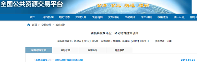 河南省新蔡縣城鄉(xiāng)環(huán)衛(wèi)一體化特許經營項目發(fā)布單一來源采購招標公告,擬推薦中國光大國際有限公司下屬光大生態(tài)資源(深圳)有限公司為項目供應商。 擬采購內容:彌陀寺鄉(xiāng)、龍口鎮(zhèn)、韓集鎮(zhèn)、孫召鎮(zhèn)、李橋鎮(zhèn)、櫟城鄉(xiāng)、棠村鎮(zhèn)、宋崗鄉(xiāng)、關津鄉(xiāng)、河塢鄉(xiāng)、佛閣寺鎮(zhèn)、余店鎮(zhèn)、陳店鎮(zhèn)、磚店鎮(zhèn)、黃樓鎮(zhèn)、澗頭鄉(xiāng)、化莊鄉(xiāng)、楊莊戶鄉(xiāng)、...